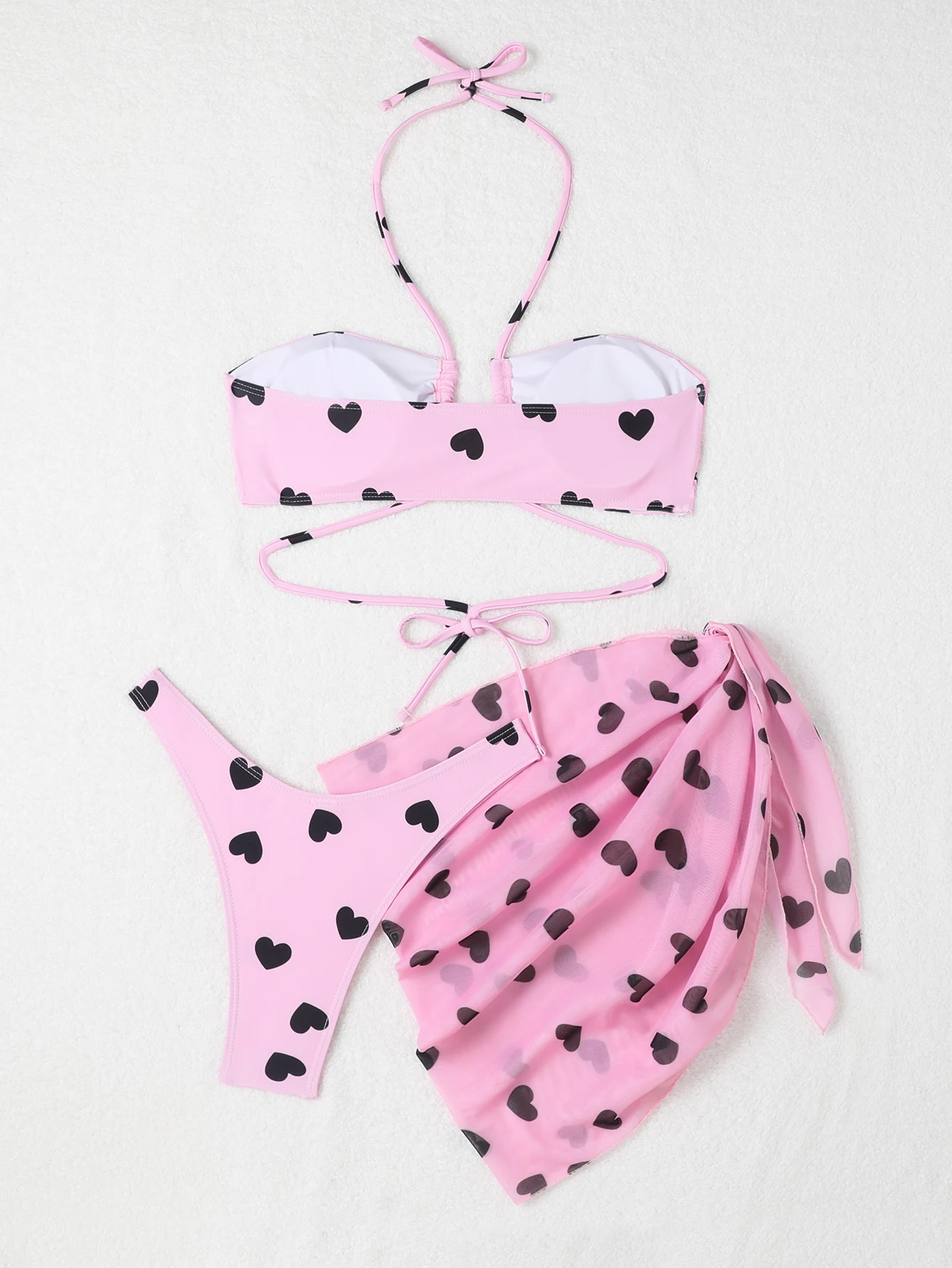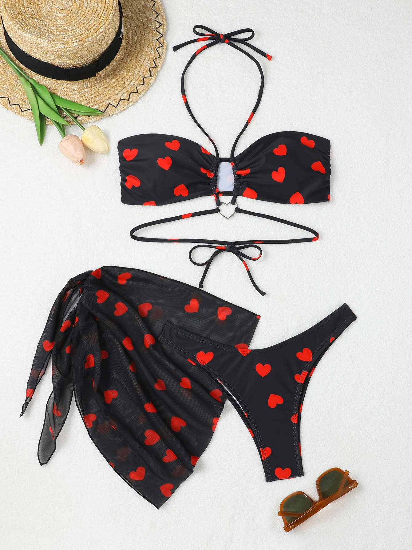 3 Pieces Heart Print Halter Bikini